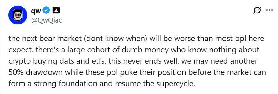 “Kripto para birimi hakkında hiçbir şey bilmeyen büyük bir aptal para kitlesi DAT ve ETF satın alıyor. Bunun sonu asla iyi bitmez” diye yazdı ve piyasaların dayanıklı bir taban oluşmadan önce başka bir “%50 düzeltmeden” geçmesi gerekebileceğini ekledi.