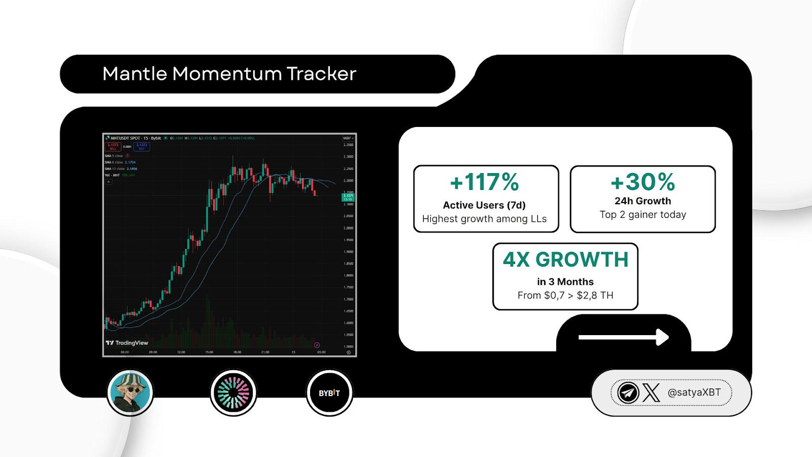 SatyaXBT Pazartesi günü X’te şunları yazdı: “Bybit’in genişlemesi ve Mantle’ın artan zincir içi etkileşimi, merkezi borsa (CEX) ile L2 arasında sağlam bir geri bildirim döngüsü oluşturmaya başladı.”